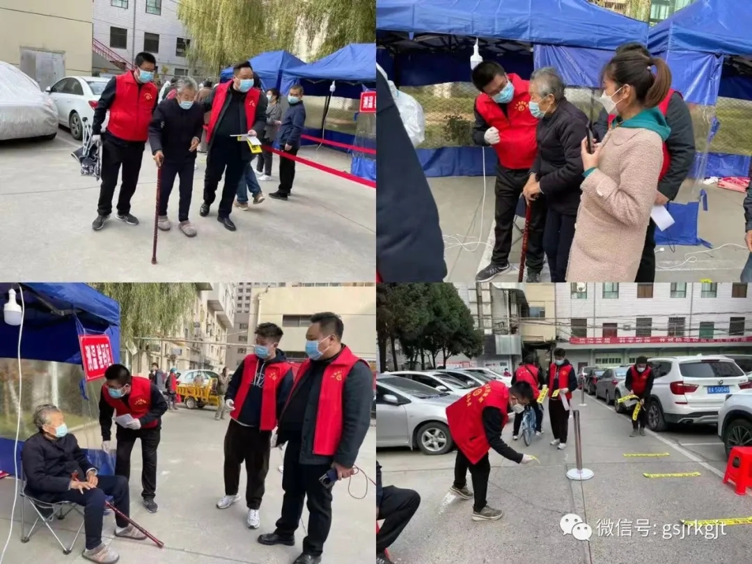 由于各組服務的社區周邊居民眾多、人口密集,各組組長帶領自己的小組成員走街串巷,挨家挨戶發放排隊號牌,有序組織群眾前往固定檢測點進行核酸檢測。耐心的解釋、奔走的身影,構成了這個深秋最溫暖的畫面。