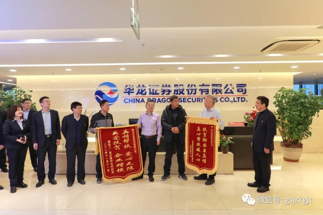 12月1日上午,華龍證券定點幫扶村舟曲縣果耶鎮吾德村黨支部書記黃幫周和真莊磨村黨支部書記韓軍龍一行向公司贈送“扶貧助困顯真情,真心幫扶暖人心”和“真情幫扶、愛心無限,關愛扶貧,企業楷模”錦旗。金控集團華龍證券黨委書記、董事長陳牧原,華龍證券黨委副書記、總經理蘇金奎代表公司接受錦旗。金控集團黨委副書記、總經理雷鐵,黨委委員、派駐紀檢監察組組長劉旺興,華龍證券在家班子成員及各部門負責人參加了會見。