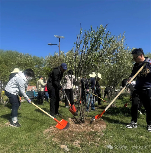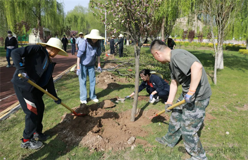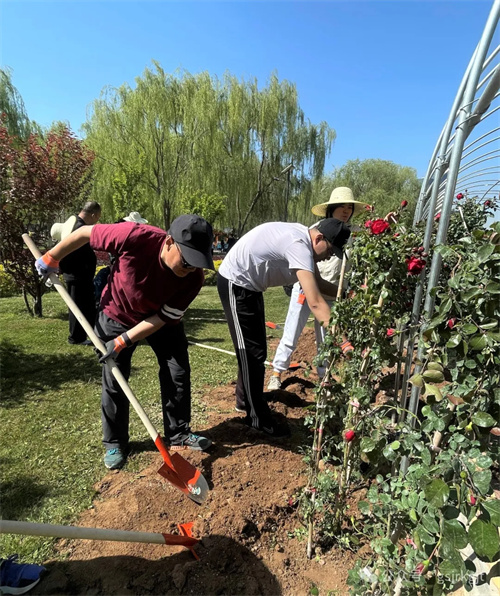 活動(dòng)當(dāng)日晴空萬(wàn)里,在公園專(zhuān)業(yè)技術(shù)人員指導(dǎo)下,集團(tuán)領(lǐng)導(dǎo)率先垂范,與干部職工“并肩奮戰(zhàn)”,大家分工明確、協(xié)作有序,共同栽種海棠、榆葉梅、碧桃等觀賞樹(shù)木和牡丹、月季、繡球等花卉,為黃河之畔再添新綠。泥土芬芳中,鐵鍬與笑語(yǔ)和鳴成曲,青年團(tuán)員們自發(fā)組成“搬運(yùn)苗木小分隊(duì)”穿梭奔忙保障供給;部分女職工組成“殺菌沃土先鋒組”,精準(zhǔn)投放藥劑為土壤消毒;由青年黨員組成的“喬木攻堅(jiān)團(tuán)” 更是勇挑重?fù)?dān),主動(dòng)承擔(dān)種植冠幅大、重量重的海棠、碧桃等喬木的任務(wù),喊著口號(hào)扶正碗口粗的樹(shù)干,覆土?xí)r反復(fù)校準(zhǔn)樹(shù)干垂直度,各小組默契配合,現(xiàn)場(chǎng)一片熱火朝天。隨著“種植先鋒隊(duì)”完成最后一株月季栽種,歷時(shí)三小時(shí)的連續(xù)奮戰(zhàn),295株新苗在公園內(nèi)指定規(guī)劃區(qū)域內(nèi)安家落戶,形成“春觀海棠、夏賞繡球、丁香獨(dú)秀、月季連廊”豐富的景觀帶。