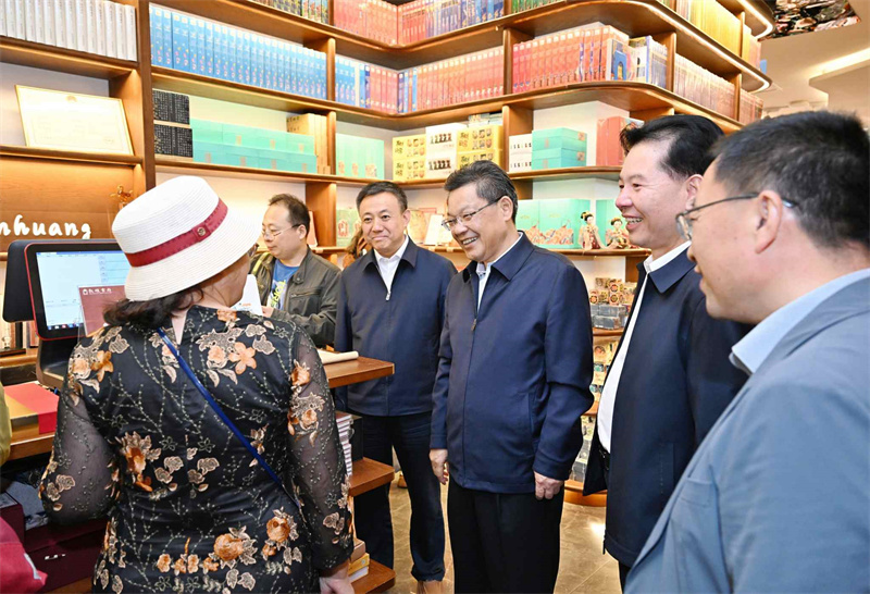 任振鶴先后來到敦煌印局、敦煌無界、敦煌書局和敦煌集·非遺文化街區(qū),詳細(xì)了解文化產(chǎn)業(yè)發(fā)展和非遺文化街區(qū)建設(shè)等情況。他指出,敦煌文化延續(xù)近兩千年,是世界現(xiàn)存規(guī)模最大、延續(xù)時(shí)間最長、內(nèi)容最豐富、保存最完整的藝術(shù)寶庫。要不斷擦亮敦煌文化名片,圍繞建設(shè)世界文化遺產(chǎn)保護(hù)的典范和敦煌學(xué)研究高地,把握傳承和創(chuàng)新的關(guān)系,找準(zhǔn)契合處、聯(lián)結(jié)點(diǎn),加快業(yè)態(tài)融合、產(chǎn)品融合、市場融合、服務(wù)融合,在更高起點(diǎn)、更高層次、更高目標(biāo)上讓敦煌文化“活起來”“潮起來”,為現(xiàn)代化建設(shè)提供有力文化支撐。