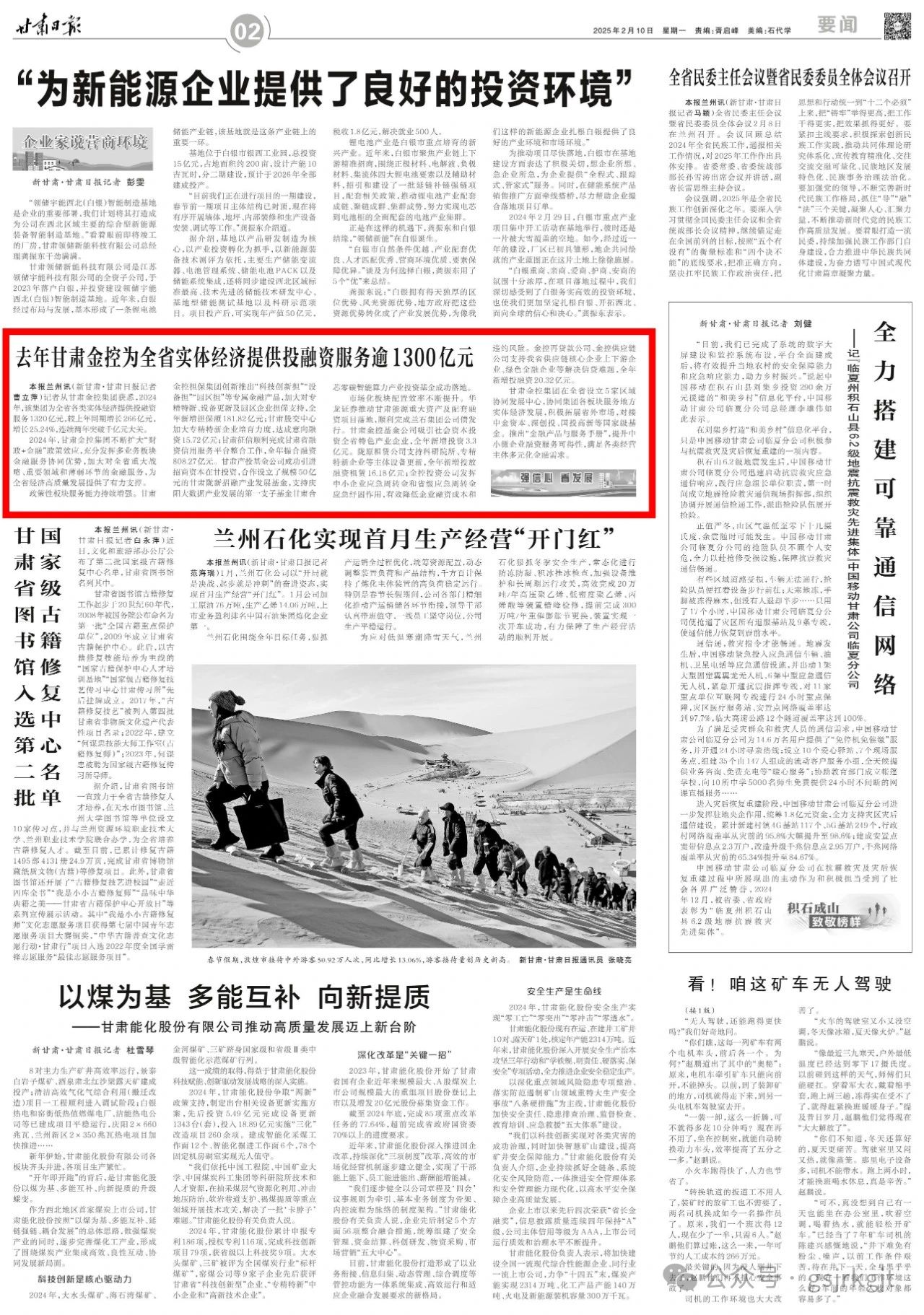 2024年,甘肅金控集團(tuán)不斷擴(kuò)大“財(cái)政+金融”政策效應(yīng),充分發(fā)揮多業(yè)務(wù)板塊金融服務(wù)協(xié)同優(yōu)勢(shì),加大對(duì)全省重大戰(zhàn)略、重要領(lǐng)域和薄弱環(huán)節(jié)的金融服務(wù),為全省經(jīng)濟(jì)高質(zhì)量發(fā)展提供了有力支撐。
