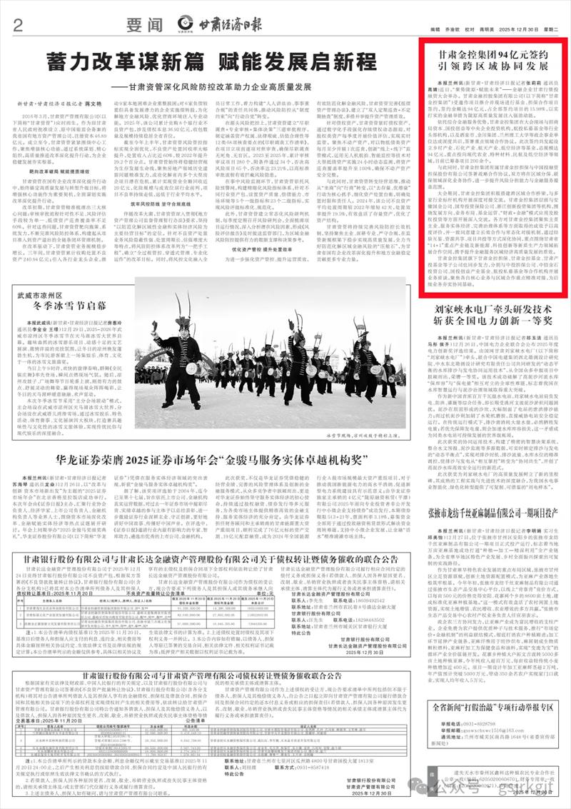 與此同時,甘肅金控集團所屬甘肅金控擔保與中國投融資擔保股份有限公司簽署戰略合作協議,雙方將在區域分保、聯保領域深化業務協作,進一步提升風險分擔能力與金融服務覆蓋范圍。