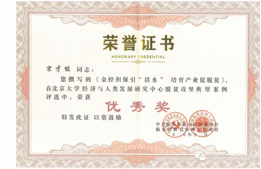 近期,臨夏州脫貧攻堅典型案例評選活動落下帷幕,金控臨夏擔保推薦的《金控擔保引活水,培育產(chǎn)業(yè)促脫貧》典型案例經(jīng)北京大學課題組與臨夏州委宣傳部、州扶貧辦、州文聯(lián)、民族日報社多輪篩選評審,在北京大學經(jīng)濟與人類社會發(fā)展研究中心脫貧攻堅典型案例評選中榮獲優(yōu)秀獎,得到州委州政府表彰。