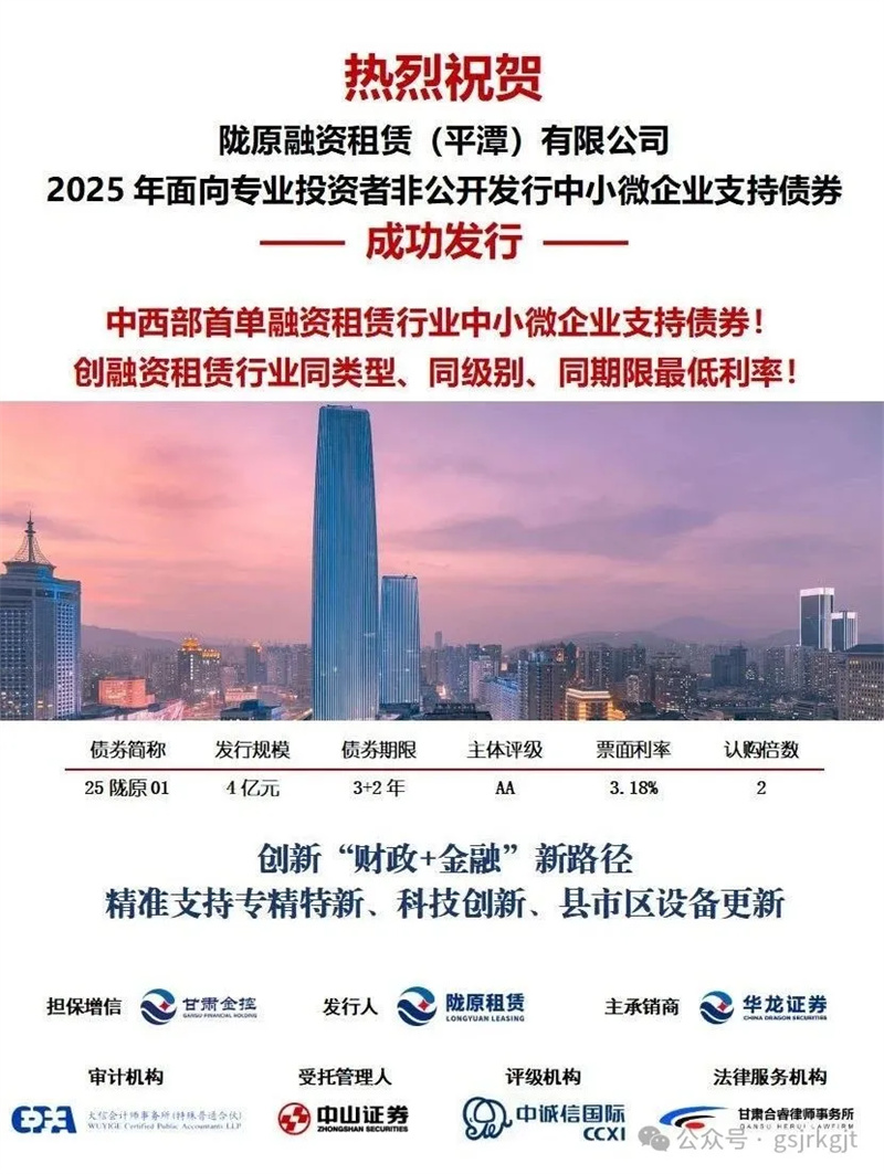 隴原租賃充分依托甘肅金控集團“財政+金融”模式優(yōu)勢,以財政政策引導(dǎo)、金融服務(wù)協(xié)同、投融資聯(lián)動等方式,吸引資本市場資金全力支持我省實體經(jīng)濟。7月28日,隴原租賃在上交所成功發(fā)行中小微企業(yè)支持債券,規(guī)模4億元,期限3+2年,票面利率3.18%,認(rèn)購倍數(shù)2倍,是中西部省份首單融資租賃行業(yè)中小微企業(yè)支持債券,創(chuàng)融資租賃行業(yè)同類型、同級別、同期限歷史最低利率。